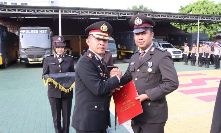 Polres Hulu Sungai Tengah Polda Kalsel – Suasana khidmat dan penuh kebanggaan menyelimuti halaman Mapolres Hulu Sungai Tengah saat digelarnya Upacara Penganugerahan Tanda Kehormatan Satyalancana Pengabdian kepada sejumlah personel Polres HST, Jum’at (30/01/2026).Upacara tersebut merupakan bentuk penghargaan negara kepada anggota Polri yang telah menunjukkan dedikasi, loyalitas, serta integritas tinggi dalam menjalankan tugas pengabdian kepada bangsa dan negara. Tanda kehormatan ini diberikan kepada personel yang telah mengabdi selama 8 tahun, 16 tahun, 24 tahun hingga 32 tahun tanpa catatan pelanggaran, sebagai wujud apresiasi atas kerja keras, disiplin, dan konsistensi dalam pelaksanaan tugas kepolisian.Pada kesempatan ini, sebanyak 10 personel Polres HST menerima Tanda Kehormatan Satyalancana Pengabdian, dengan rincian 6 personel menerima Satyalancana Pengabdian 24 Tahun dan 4 personel menerima Satyalancana Pengabdian 8 Tahun. Penganugerahan tersebut menjadi momen istimewa yang tidak hanya membanggakan para penerima, namun juga menjadi inspirasi bagi seluruh anggota Polres HST.Dalam amanat Kapolda Kalimantan Selatan yang dibacakan oleh Kapolres HST AKBP Jupri JHP Tampubolon, S.I.K., M.Si., disampaikan bahwa Satyalancana Pengabdian bukan sekadar simbol masa kerja, melainkan bukti nyata pengakuan negara atas dedikasi, integritas, dan loyalitas personel Polri dalam mengemban amanah sebagai pelindung, pengayom, dan pelayan masyarakat.“Penghargaan ini hendaknya disyukuri dan dijadikan motivasi untuk terus meningkatkan kualitas pelayanan kepada masyarakat serta menjadi teladan bagi personel lainnya,” demikian kutipan amanat yang disampaikan.Lebih lanjut, penganugerahan Satyalancana Pengabdian diharapkan mampu menjadi penyemangat baru bagi seluruh personel Polres HST untuk terus meningkatkan profesionalisme, kapasitas, dan kapabilitas dalam menjalankan tugas, seiring dinamika serta tantangan kamtibmas yang terus berkembang di tengah masyarakat.Pada momen tersebut, Kapolres HST juga secara pribadi dan atas nama pimpinan serta keluarga besar Polres Hulu Sungai Tengah menyampaikan ucapan selamat dan apresiasi kepada seluruh personel penerima tanda kehormatan. Beliau berharap prestasi serta pengabdian yang telah ditorehkan dapat terus dipertahankan bahkan ditingkatkan di masa mendatang.Upacara berlangsung tertib, khidmat, dan sarat makna, mencerminkan komitmen kuat Polres HST untuk senantiasa hadir di tengah masyarakat serta terus memberikan pelayanan dan pengabdian terbaik demi terwujudnya keamanan dan ketertiban yang kondusif di wilayah hukum Kabupaten Hulu Sungai Tengah.